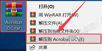 1.选中【Acrobat DC】压缩包,鼠标右击选择【解压到Acrobat DC】。