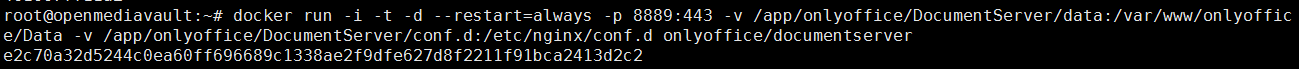 docker run -i -t -d --restart=always -p 8889:443 -v /app/onlyoffice/DocumentServer/data:/var/www/onlyoffice/Data -v /app/onlyoffice/DocumentServer/conf.d:/etc/nginx/conf.d onlyoffice/documentserver