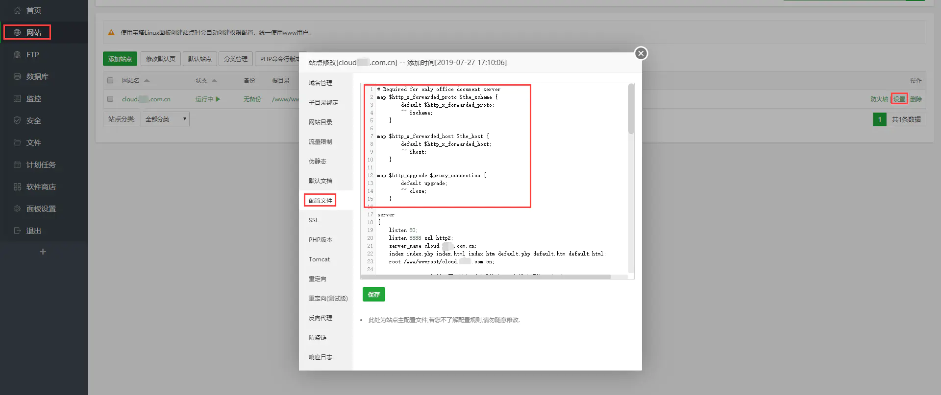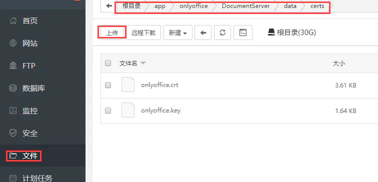 打开宝塔面板,将key和crt上传至/app/onlyoffice/DocumentServer/data/certs目录下