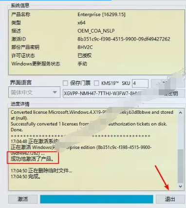 4)当显示【成功地激活了产品】证明激活成功,点击【退出】。若激活失败,尝试方法二。
