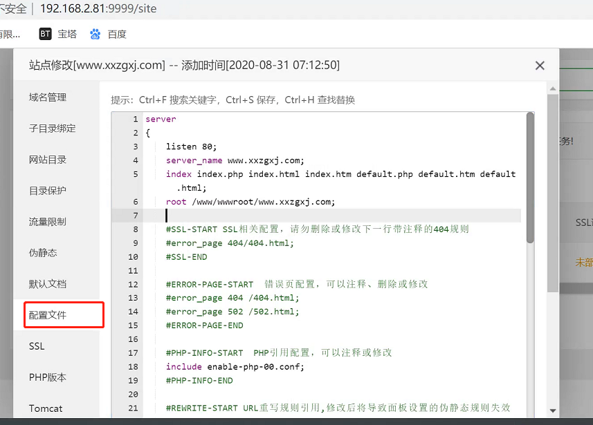 然后把如下复制进去,可以使用通过宝塔图形化界面编辑