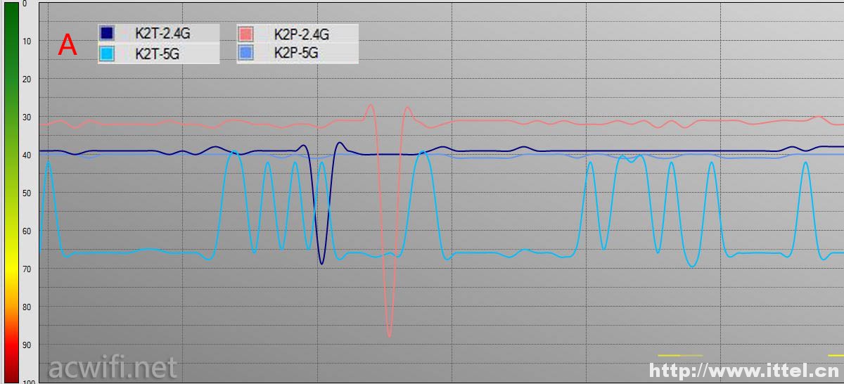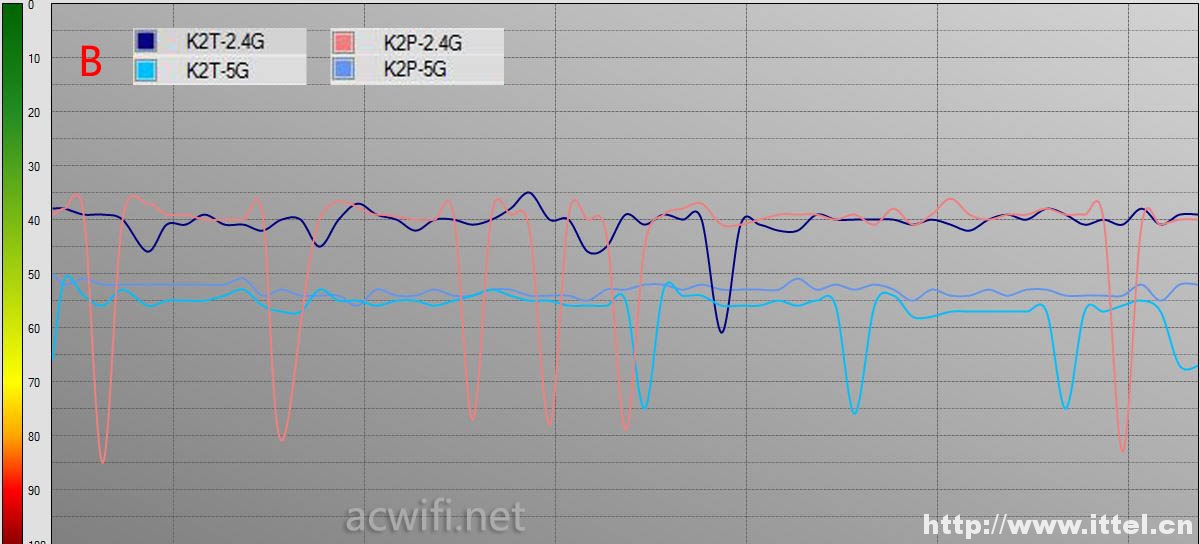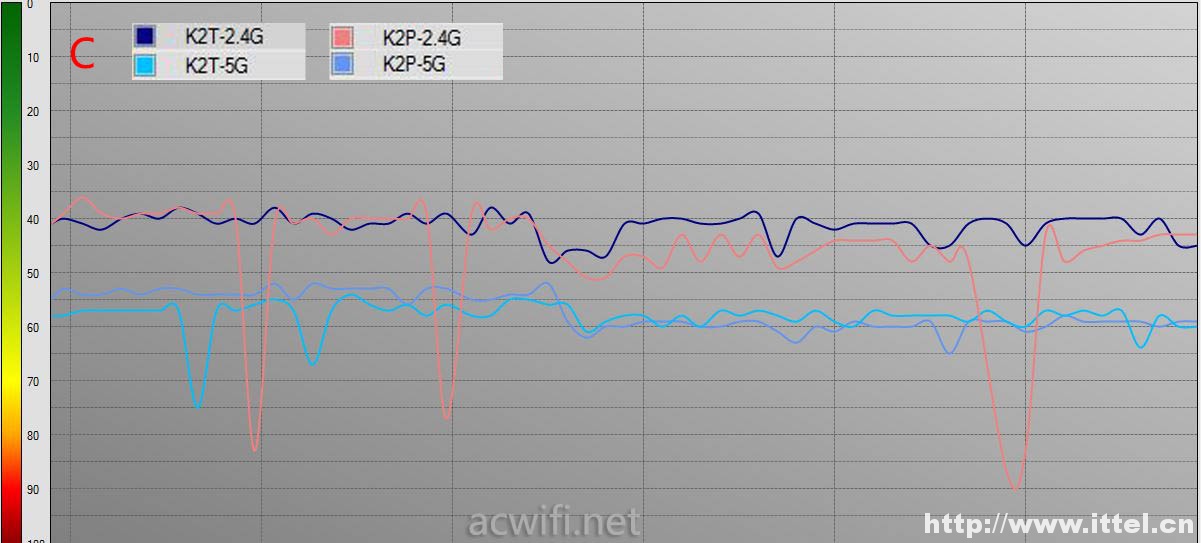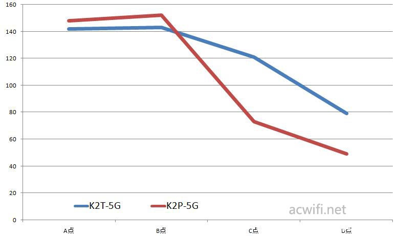 在隔了一墙的A点位置,K2P的2.4G信号比K2T明显要强些,5G信号其实两者相差不大,K2T波动幅度大,因为2个路由器放得比较近,互相会有干扰。