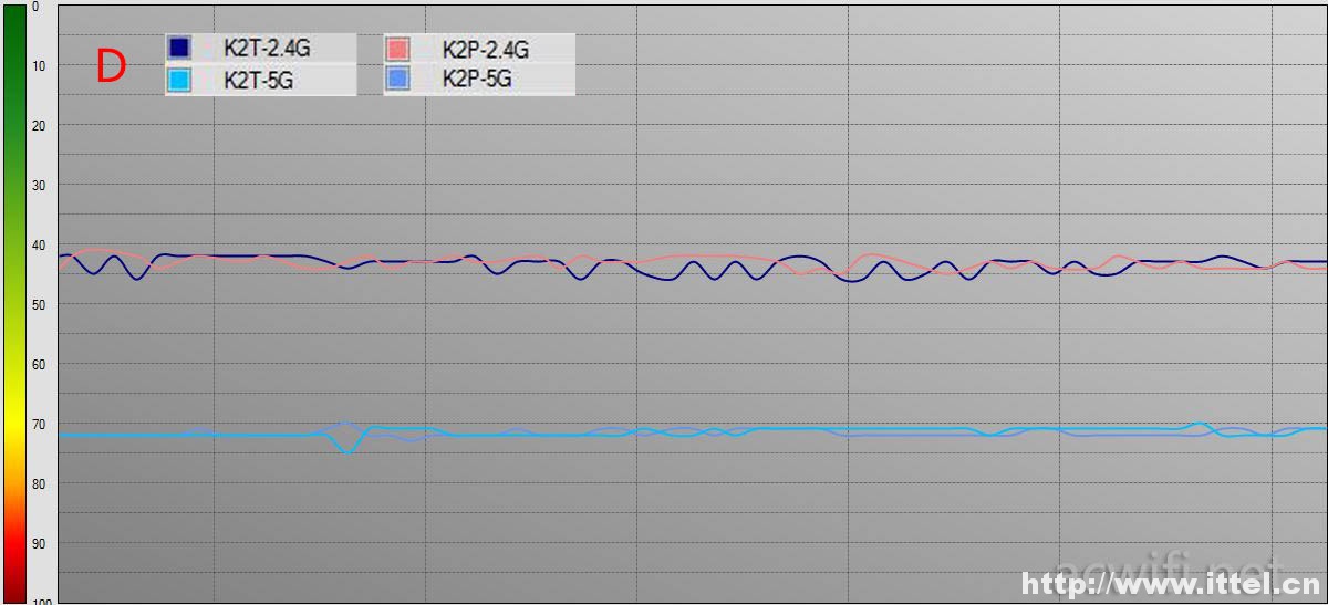 因为2.4G无线连接速率上的先天优势,使得银色版的K2P在四个位置都比K2T快;