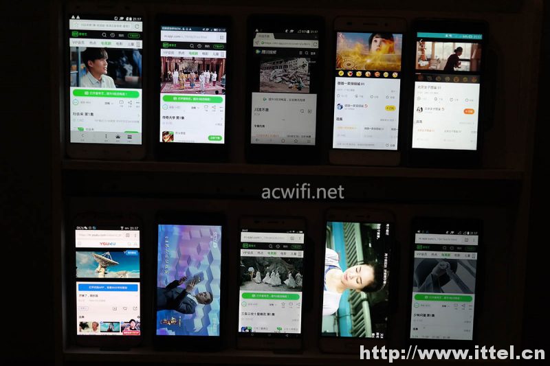 带机量很难测试,因为没有足够的设备,如果手里有100台手机就方便测试,10台手机,4台连接K2T的5G,6台连接2.4G,全部打开各大视频网站,观看视频,电脑用网线连接着上网,另外还有1台手机连接着5G,玩王者荣耀。播放视频的10台手机如下: