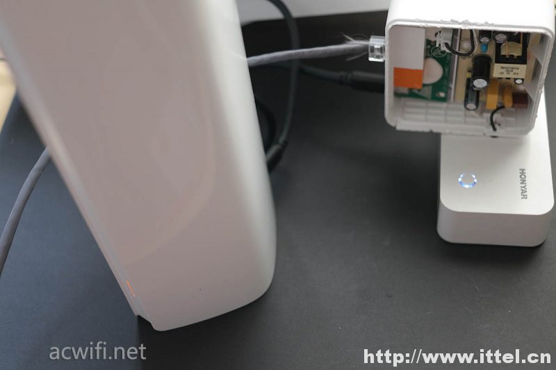 因此,我从TB上买来了一条 Type-C数据线,连接上K2T,电源灯亮,心里暗喜,然后用网线连接电脑再连接K2T的LAN口,没有任何反应。本地连接提示红色叉叉,就是没有插网线的状态,试了2个LAN口也是如此,没有网络信号,但无线WIFI可以连接,可以登录斐讯管理界面,我以为只是LAN口这样,然后光猫的网线连接K2T的WAN口,在界面里提示WAN口没有连接,也就是说,全部网口都不可以用。(下图中的黑色数据线)
