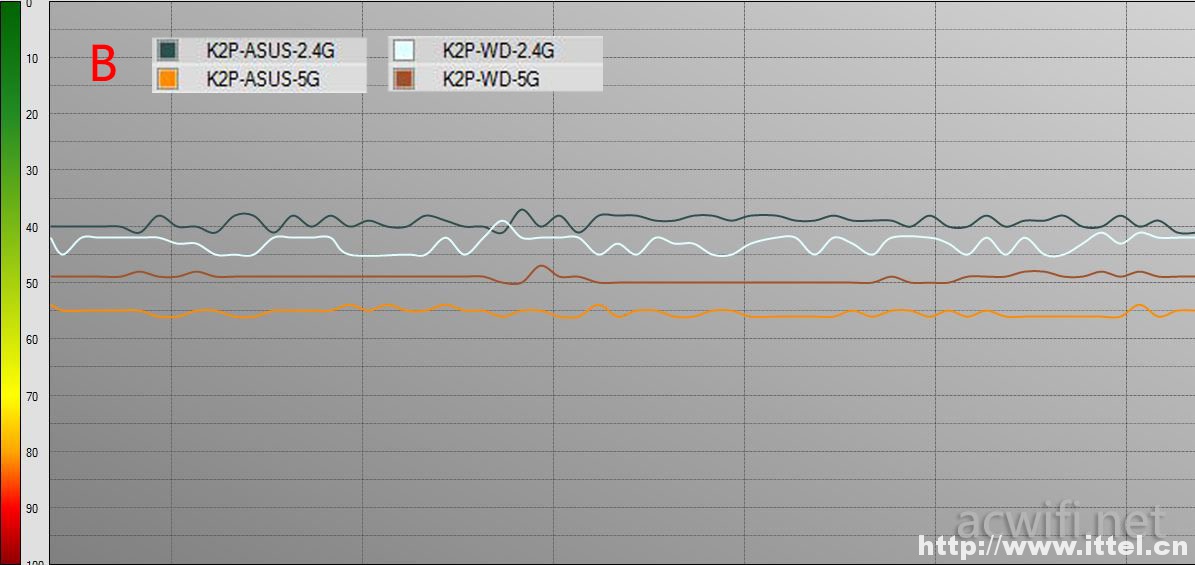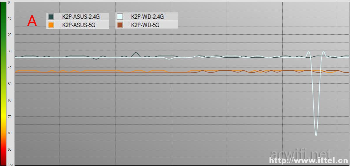 A点位置,第一次遇见这样吻合的信号强度对比。近距离下,两者无线信号强度一样;